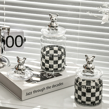 Modern Bear Lid Checkerboard Decorated Minimalist Style Glass Food Storage Jars for Kitchen Coated Beverage Use
